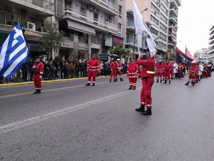 Παρά τη βροχερή μέρα οι εθελοντές μας παρέλασαν περήφανα στους κεντρικούς δρόμους της πόλης, ακολουθώντας τα σύμβολα του Κινήματος τα οποία κρατούσαν εθελοντές με διακεκριμένη δράση. Μέσα από τον ενθουσιασμό και την έμπρακτη πίστη τους στα ιδανικά του ανθρωπισμού και της ενότητας που τους χαρακτηρίζουν, ιδέες από τις οποίες διαπνεόταν άλλωστε και η Ελληνική Επανάσταση του 1821, μετέφεραν μια πολύ δυνατή εικόνα ενός ισχυρού Ελληνικού Ερυθρού Σταυρού, πάντα έτοιμου να συνδράμει τους έλληνες πολίτες σε κάθε τους δοκιμασία. Το συγκεντρωμένο πειραϊκό πλήθος επιφύλαξε ένα πολύ ζεστό χειροκρότημα για τους εθελοντές μας σε αναγνώριση της παρουσίας τους.